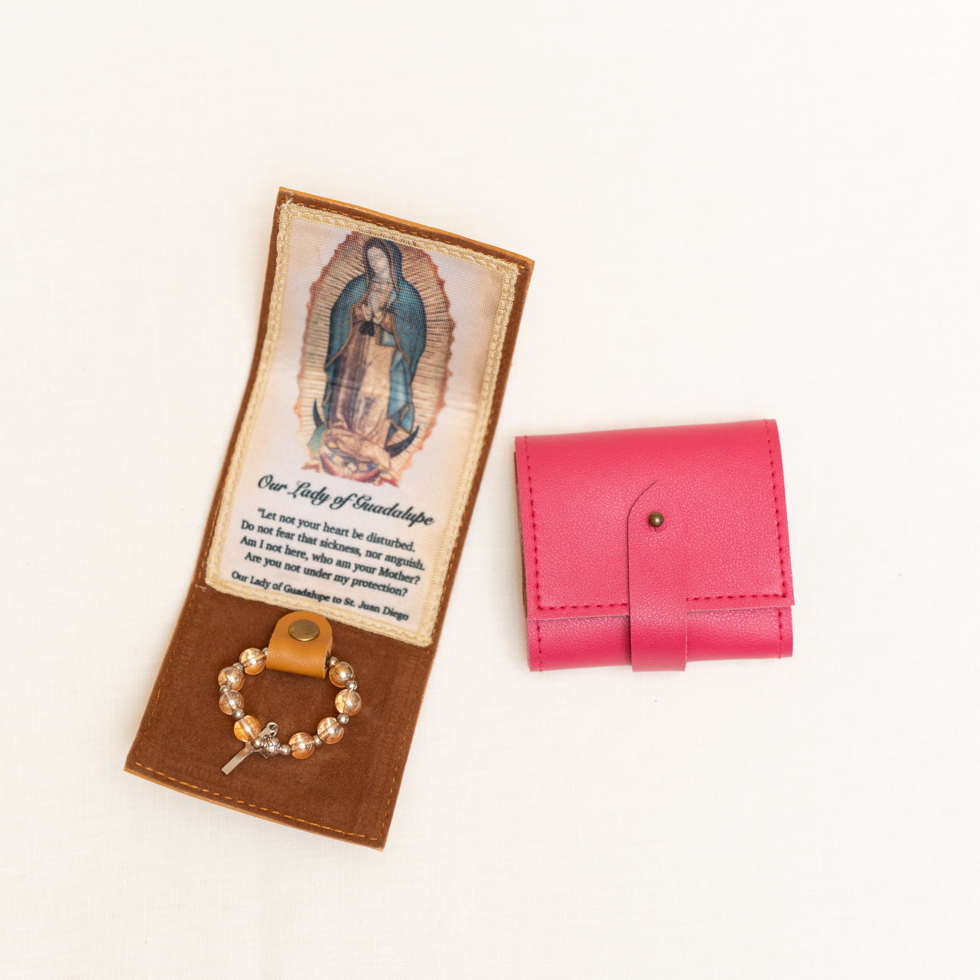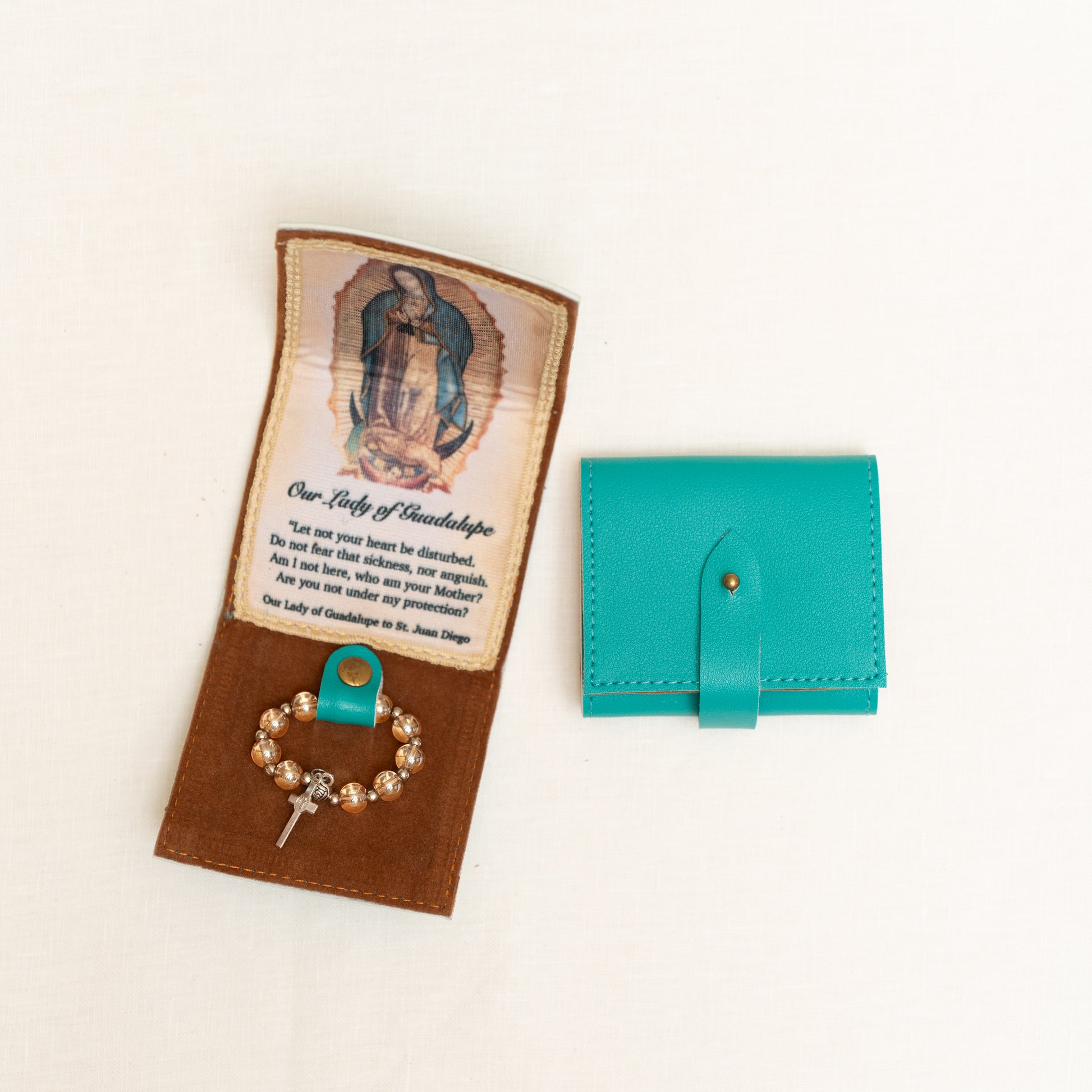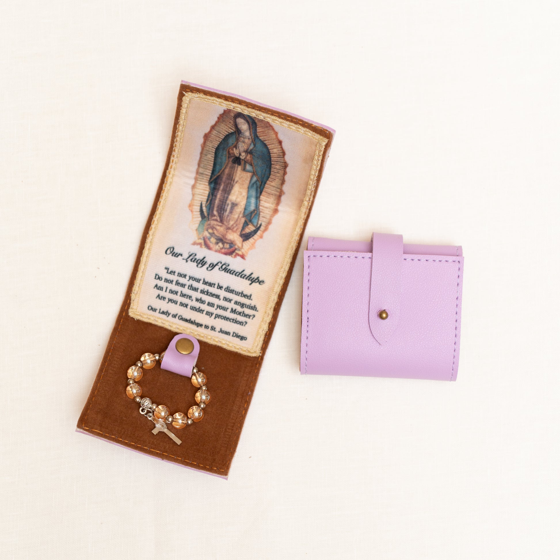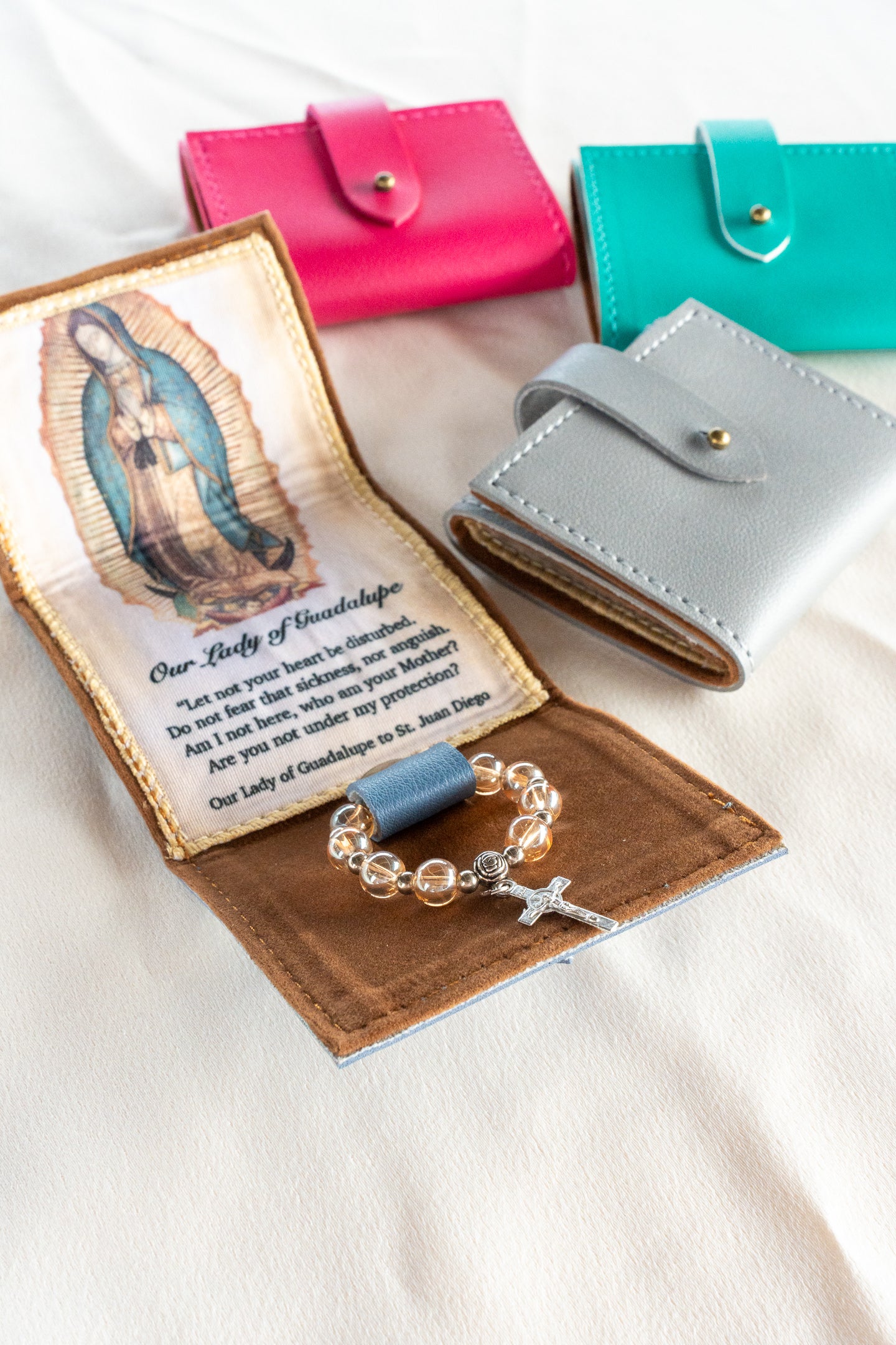 Keep Mama Mary always close to you with this beautiful synthetic leather purse with a small tilma and a ring rosary. Available in Magenta, Copper, OLG Teal, Gray and Dusty Blue.