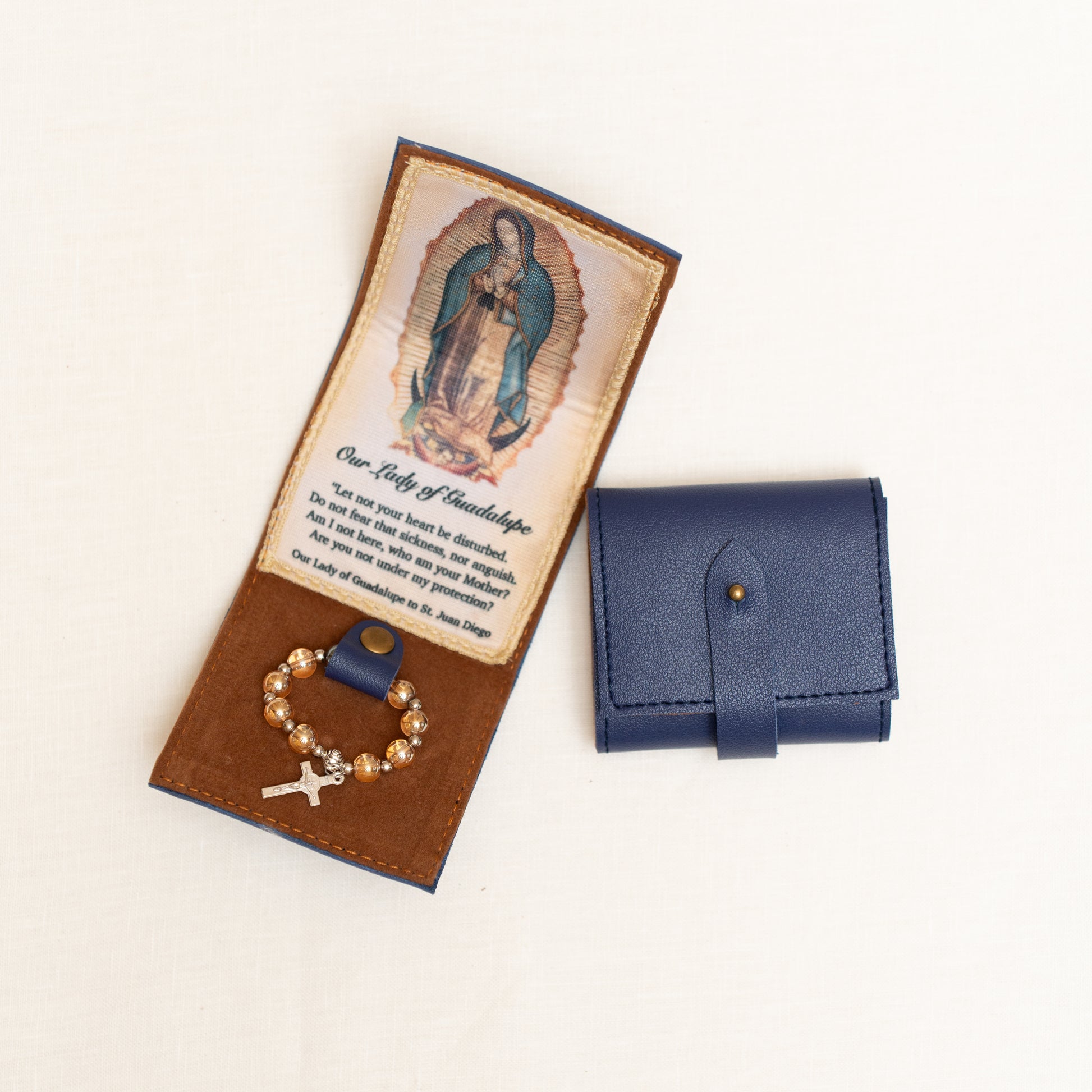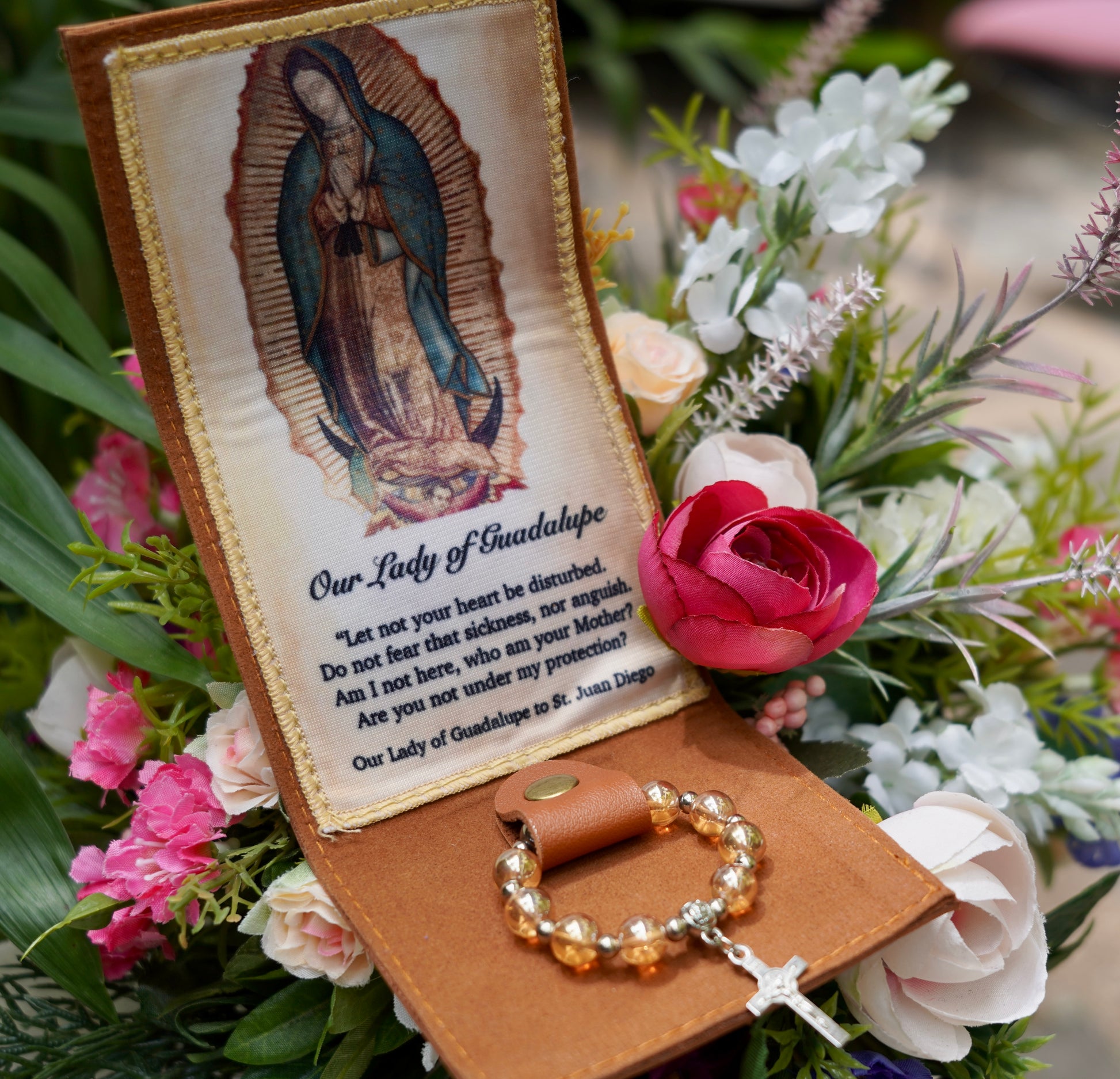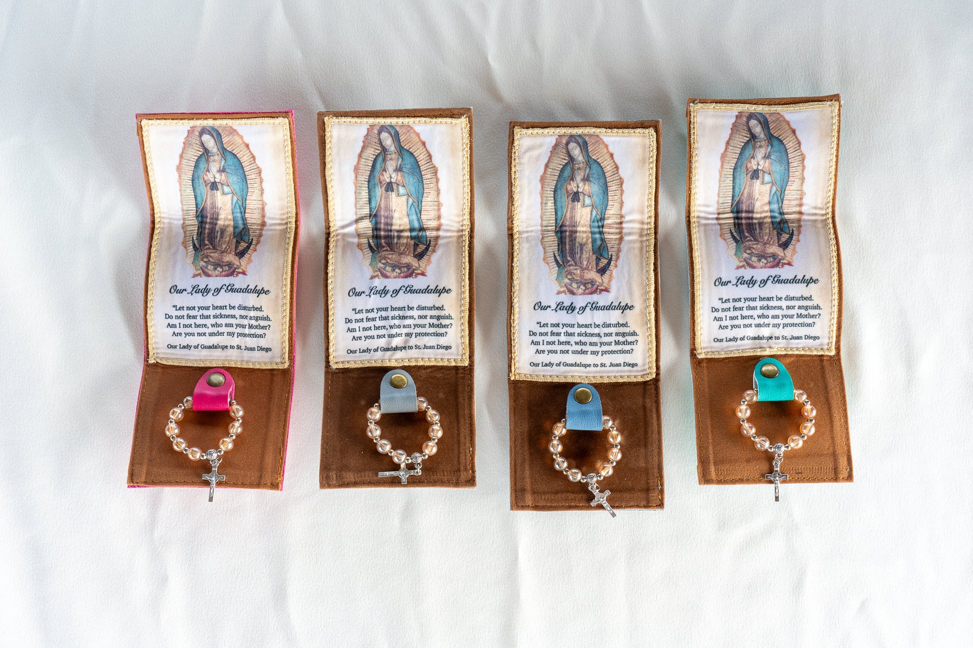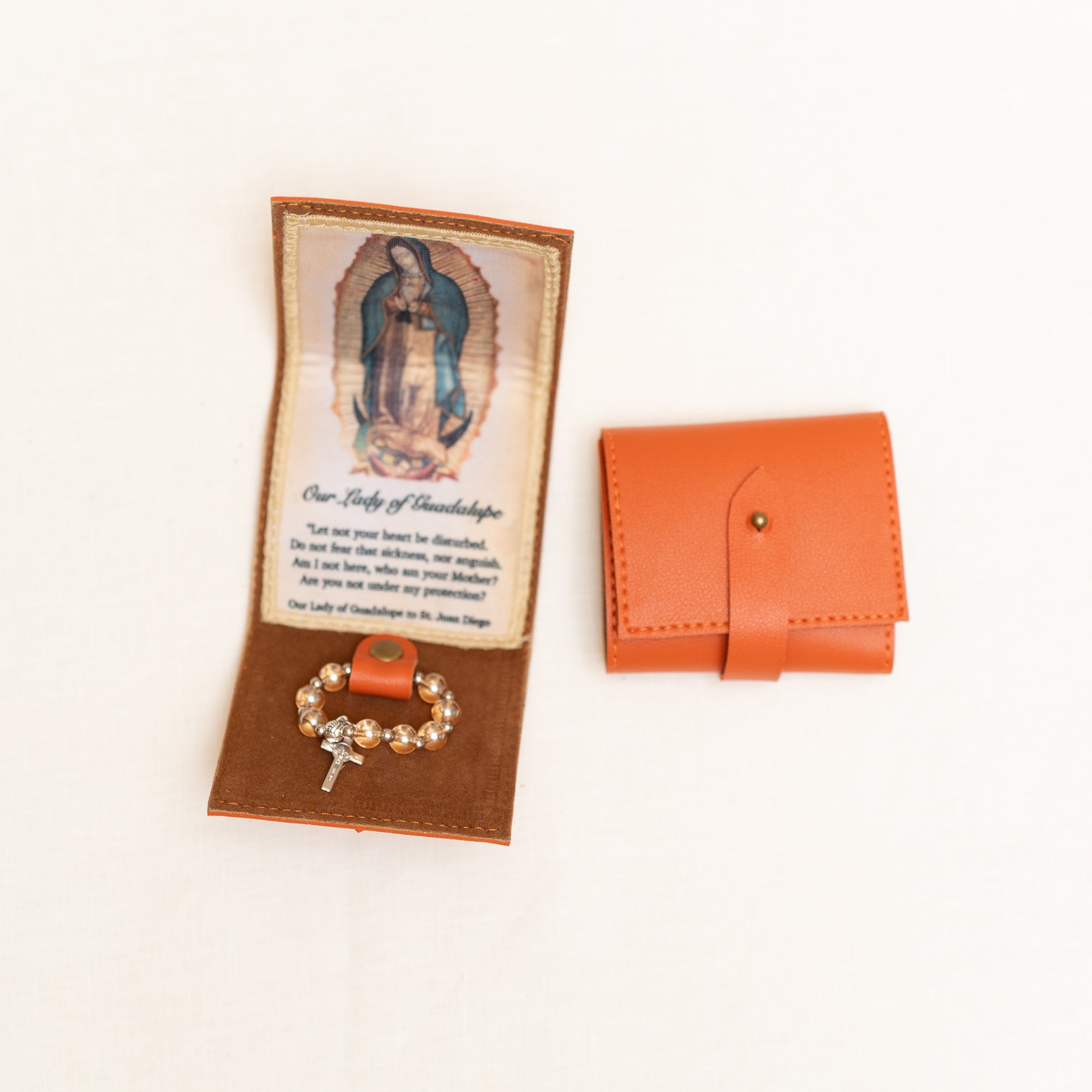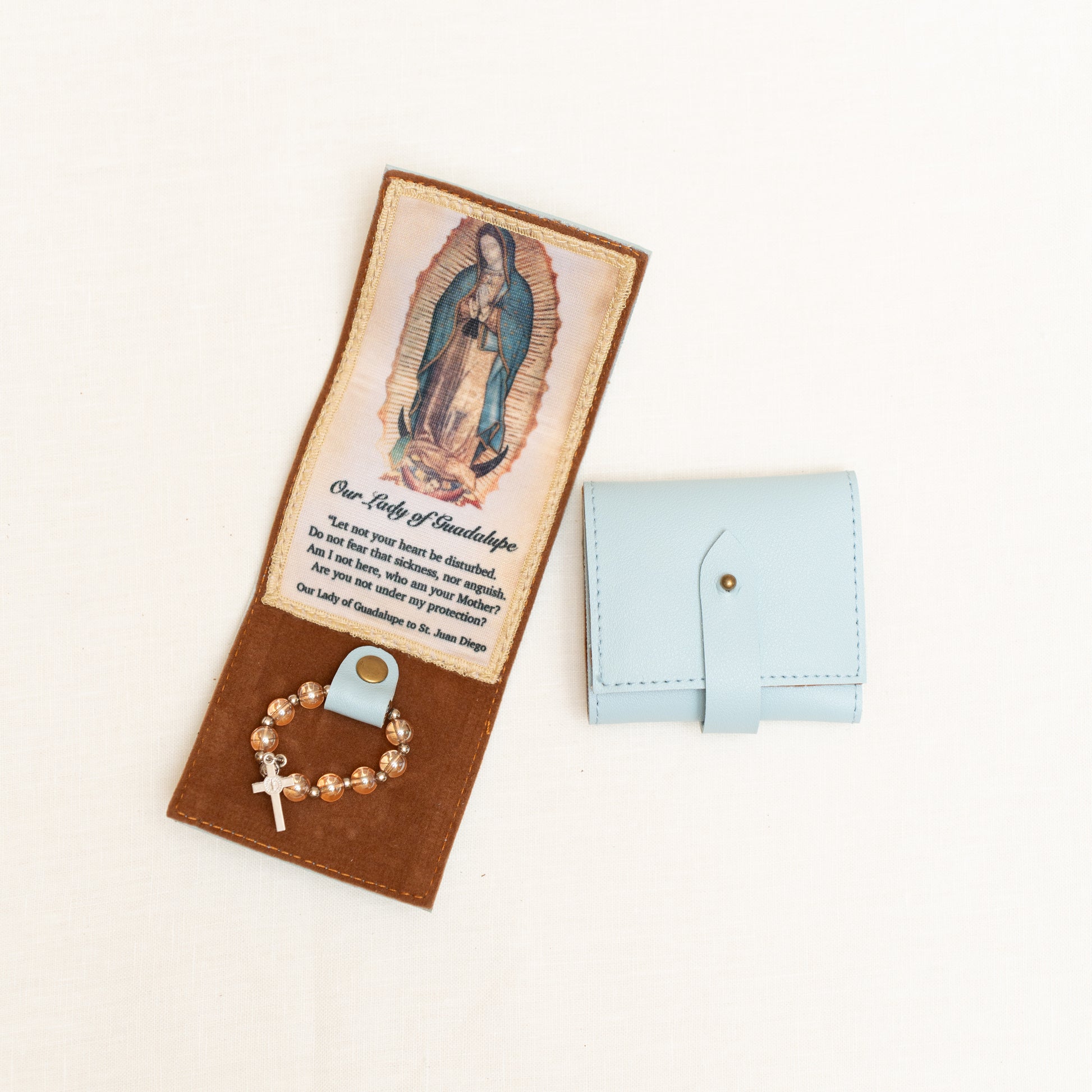 Keep Mama Mary always close to you with this beautiful synthetic leather purse with a small tilma and a ring rosary. Available in Magenta, Copper, OLG Teal, Gray and Dusty Blue.