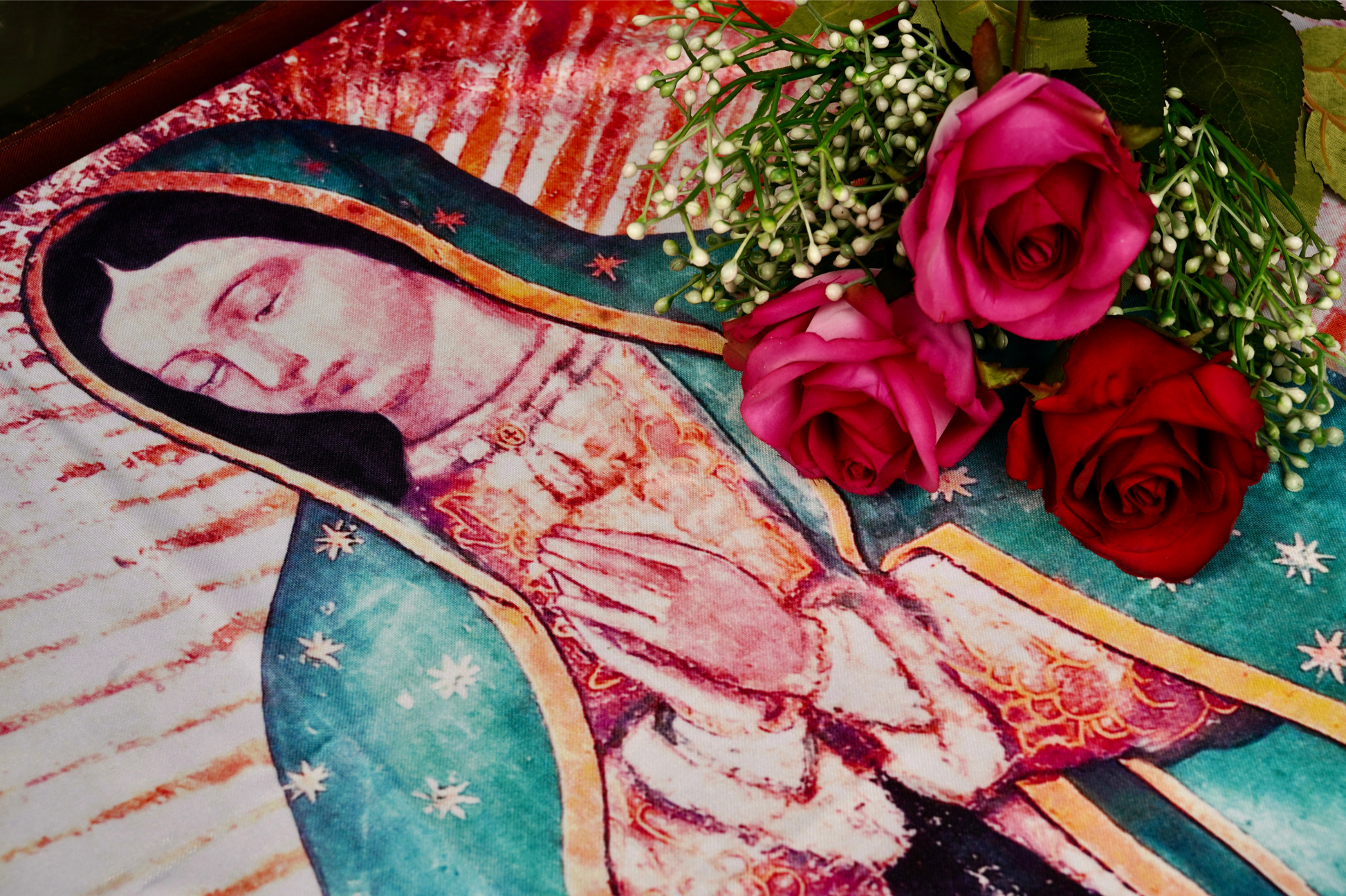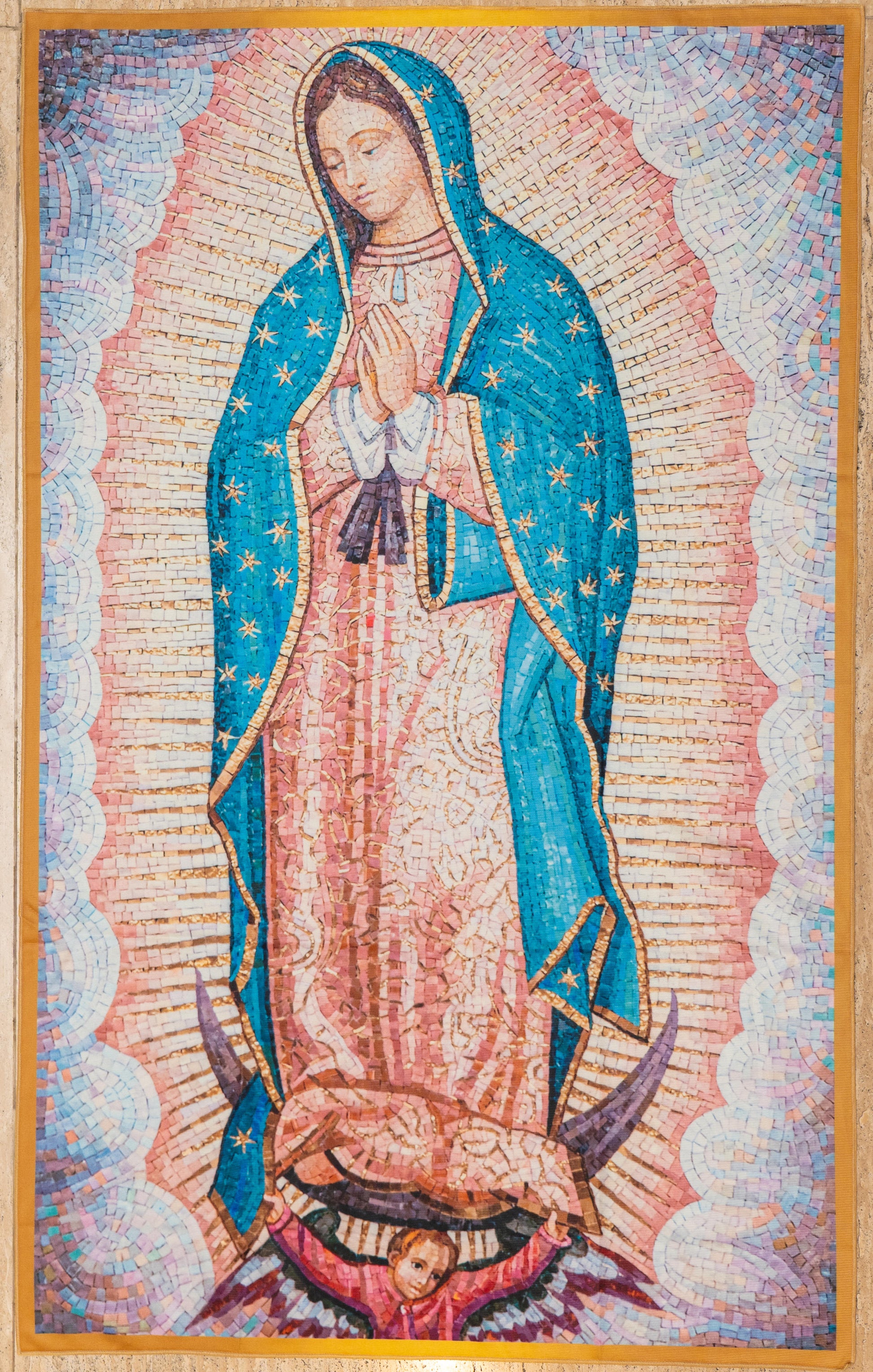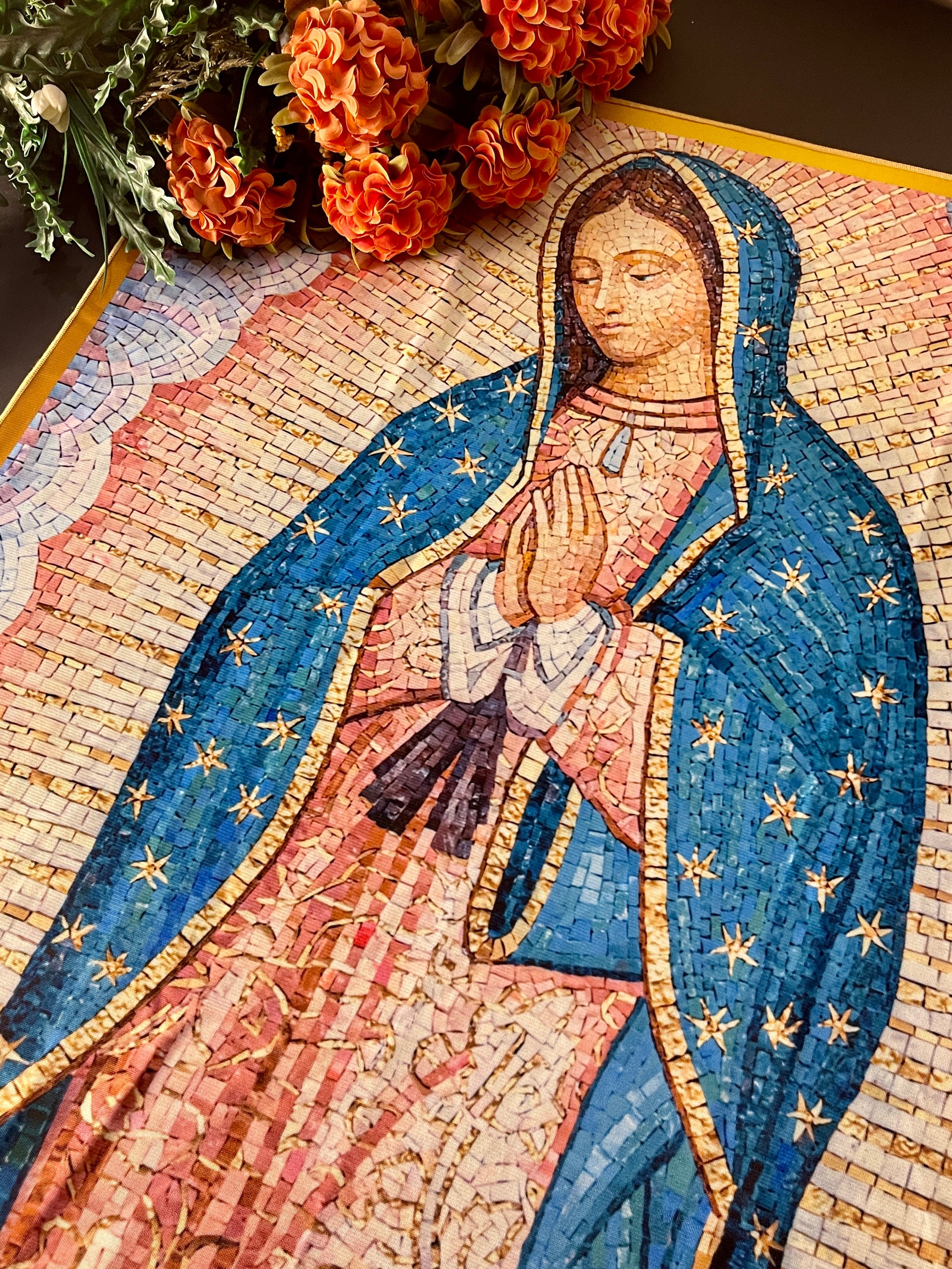 C. Mosaic Tilma: Our Lady's image formed in an intricate tile pattern. Comes with prayer booklet.