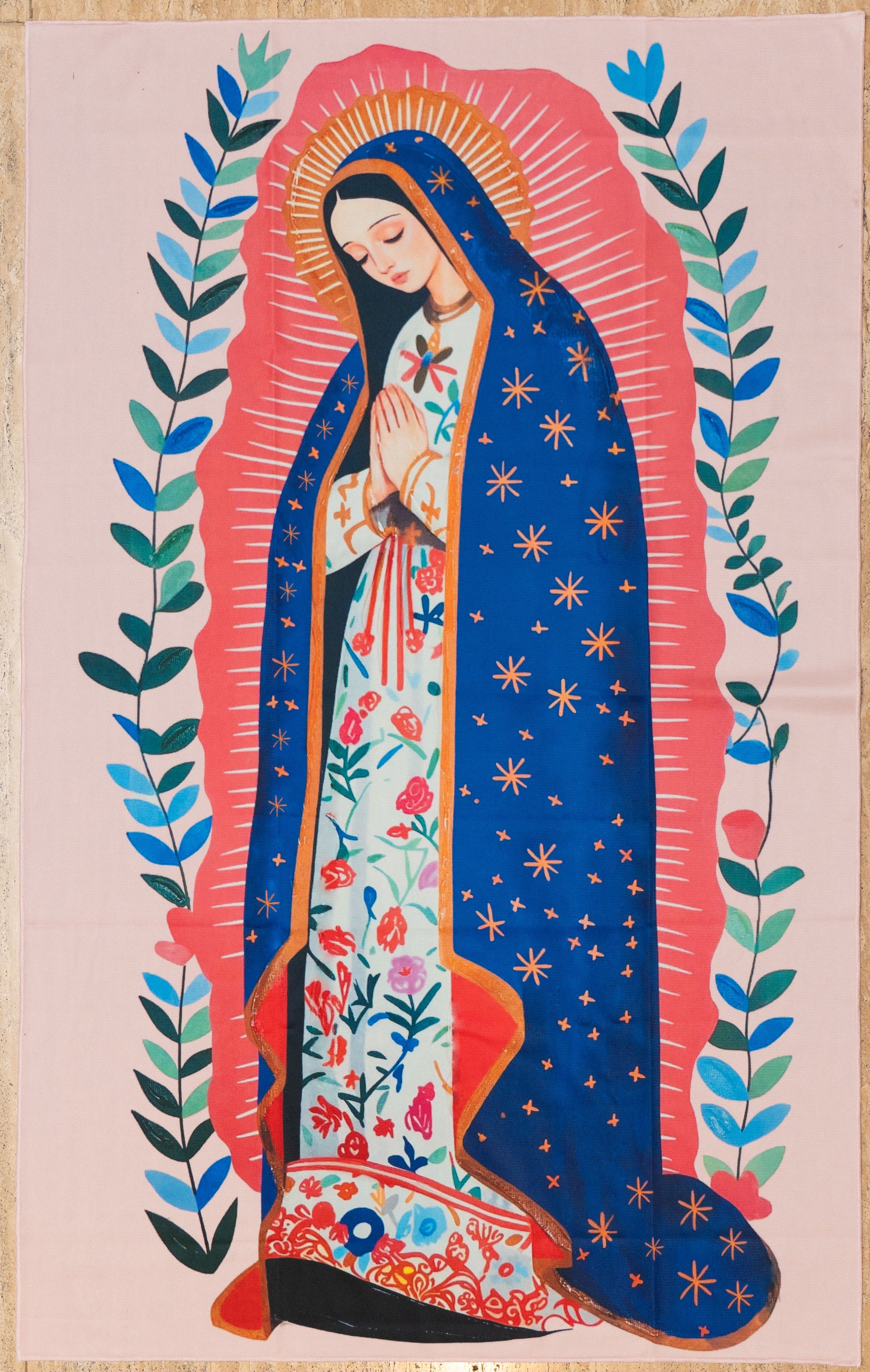 D. Floral Tilma: A graceful modern interpretation of the tilma, blending devotion and design. The deep blue mantle adorned with golden stars and vibrant floral details celebrates faith with timeless beauty.